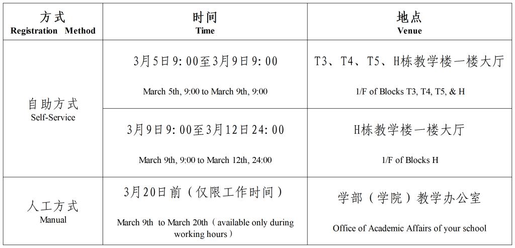 (2) Manual Registration: If self-service registration fails or if re-registration is needed, please bring your valid ID documents to the Office of Academic Affairs of your school, where the secretary will assist with registration.