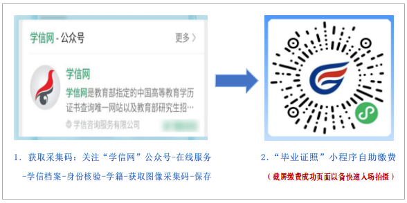 1.2025114-10,请在学信网公众号获取并保存学信网图像采集码,并扫码进入毕业证照小程序识别关联学信网图像采集码自助缴费(25/人),操作详见附件1请务必提前完成上述操作,否则无法入场排号拍摄